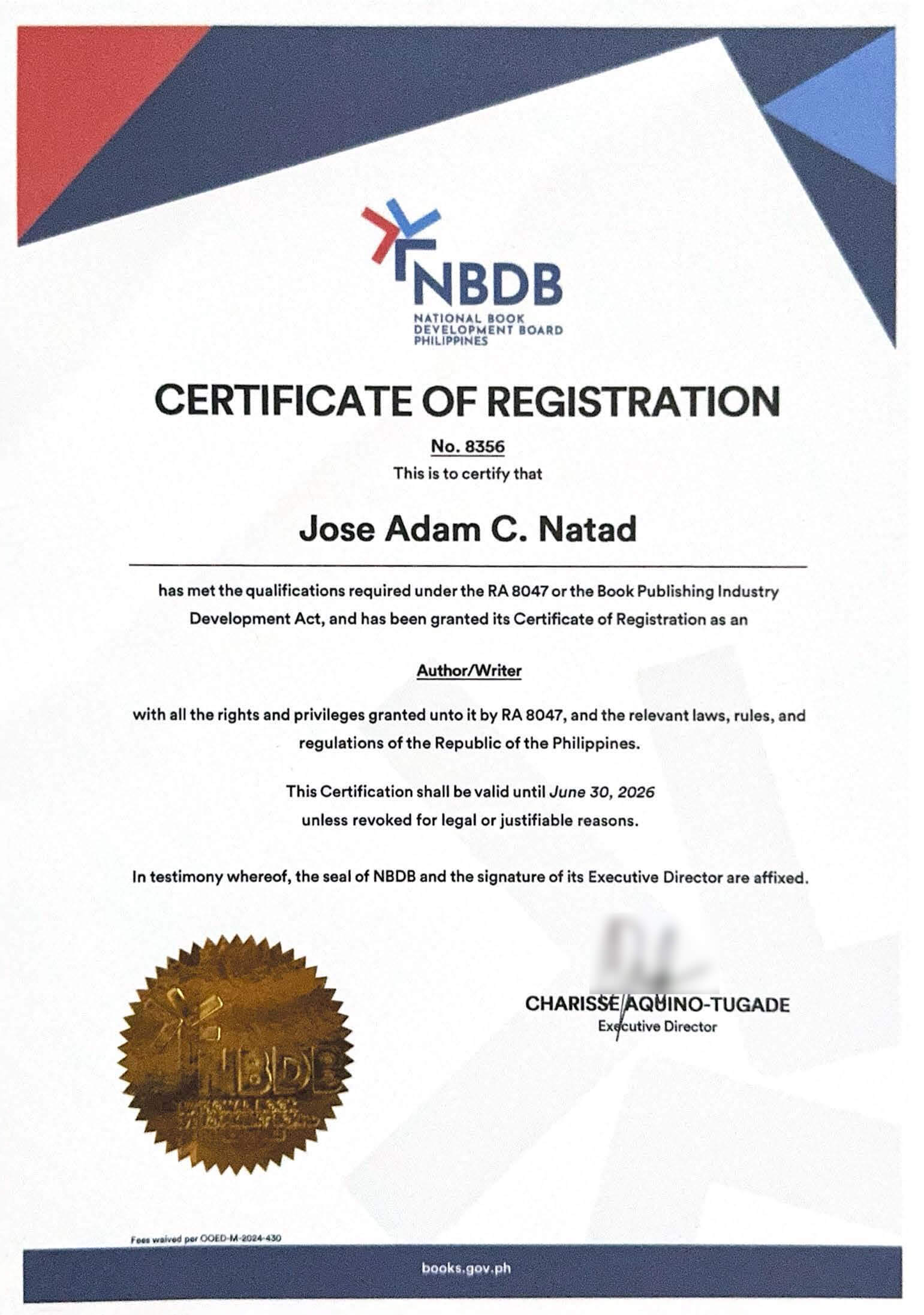 This certificate, issued by the National Book Development Board (NBDB), recognizes Adam Natad as a registered Author/Writer. His works are cataloged through the National Library of the Philippines (NLP).